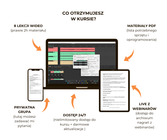 Po kursie wiesz, jak wygląda cały proces nagrywania i obróbki materiału dźwiękowego oraz wideo „od kuchni”. Od surowych śladów audio do zmiksowanego i wymasterowanego nagrania, gotowego do publikacji. Wiesz, jakiego sprzętu i oprogramowania potrzebujesz, aby to zrealizować, mimo, że jesteś laikiem w tej dziedzinie.