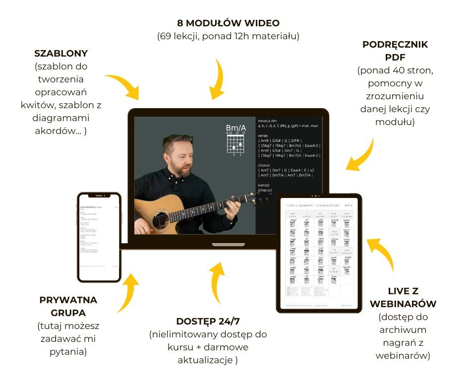 Pokazuję, jak stworzyć czytelne, jednoznaczne opracowanie akordowe, które stosują profesjonalni muzycy, tzw. „kwit”. Opracowanie zawiera akordy w systemie amerykańskim, najczęściej stosowanym na świecie i w polsce w muzyce rozrywkowej, podział na takty i całą formę utworu od A do Z. Uczę, jak łączyć grę ze śpiewem. Pokazuję, jak czytać tabulatury i zapis nutowy i jak przełożyć te zapisy na grę na gitarze.